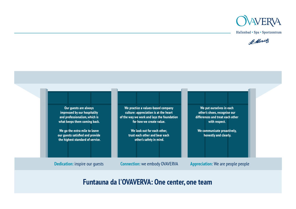 It all started with a vision. When the construction of a new indoor pool for St. Moritz was under consideration, the idea for the OVAVERVA was born: A new centre should add value to the entire region in terms of swimming, leisure, fitness, spa, wellness and gastronomy, and cater for all outdoor activities in the Engadine. Of the many indoor pools and wellness facilities in the Upper Engadine at that time, only a very few were freely accessible as they were mostly integrated into luxury hotels. By building the OVAVERVA, the municipality of St. Moritz sought to close this gap in the leisure, spa and sports offering in the Upper Engadine.